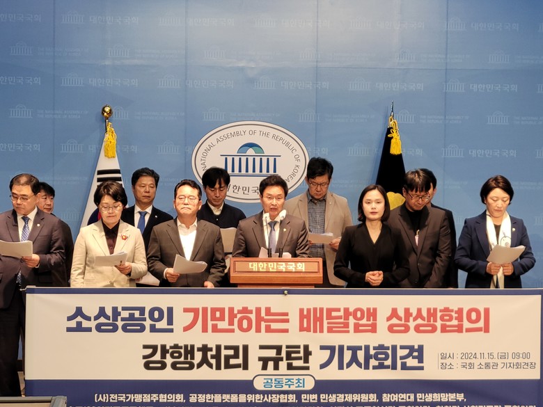 정진욱 의원은 “ 상생협의체에 참여한 소상공인 단체 중 배달업 비중이 높은 ‘( 사 ) 전국가맹점주협의회 ’ 와 ‘ 한국외식산업협회 ’ 가 공익위원의 중재안에 반대하며 퇴장했음에도 , 상생협의체는 상생안을 강행했다 ” 며 , “ 입점업체의 목소리를 반영하지 않은 상생안은 쓸모가 없다 ” 고 비판했다 .