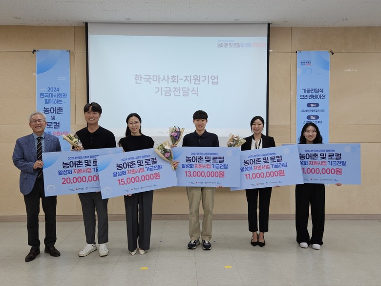 [세계타임즈 = 송민수 기자] 지난 5일 오후, 한국마사회(회장 정기환)와 경기사회복지공동모금회(대표 권인욱), 한국사회적기업진흥원(원장 정현곤)이 함께 추진한 “2024년도 농어촌·로컬 활성화 지원사업”(이하 지원사업)의 선정기업에게 프로젝트 사업비를 전달하는 행사가 소셜캠퍼스온 충남에서 개최됐다.