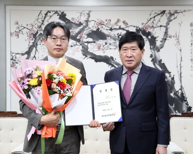 | ▲ 1230_충남도의회 사령장 수여식 (오른쪽 홍성현 의장, 왼쪽 구상 신임 사무처장) |