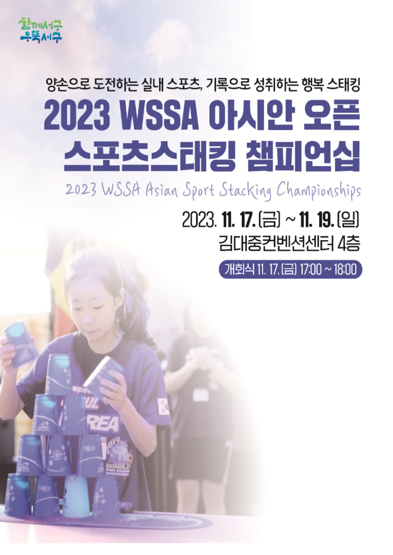 - 10개국 350여 명 선수 출전…세계 랭킹 1위들 기록 경신 나서 [세계타임즈=서구 손권일 기자] 광주광역시 서구(구청장 김이강)가 아시아 10개국이 참여하는 대규모 국제스포츠대회를 개최한다. 서구는 오는 17일부터 19일까지 3일간 광주 김대중컨벤션센터에서 ‘2023 WSSA 아시안 오픈 스포츠스태킹 챔피언십대회’가 열린다고 밝혔다.