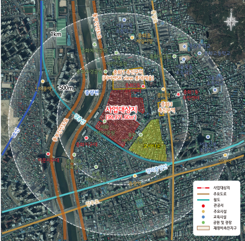 대상지는 지하철 7호선 중화역과 가깝고 중랑천 인근에 위치해 교통과 자연환경이 모두 우수한 지역이나, 노후 건축물이 밀집해 있어 주거환경이 열악했던 곳이다. 지난 24년 11월 14일 모아주택 6개소가 사업추진 구역으로 모아타운 관리계획 수립 및 지정 고시가 완료됐다.