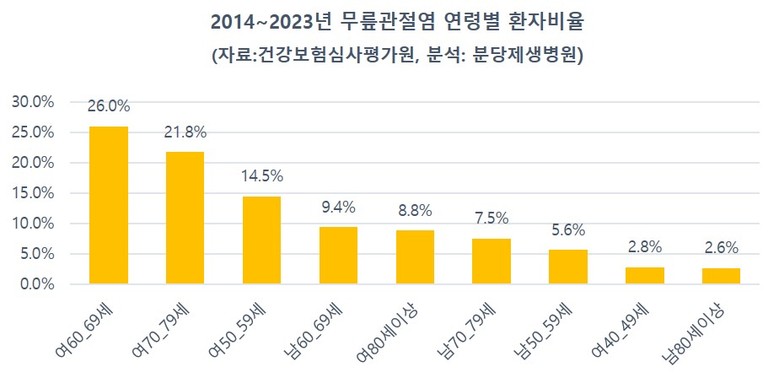 | ▲. 2014~2023년 무릎관절염 연령별 환자비율 (자료:건강보험심사평가원,분석:분당제생병원) |