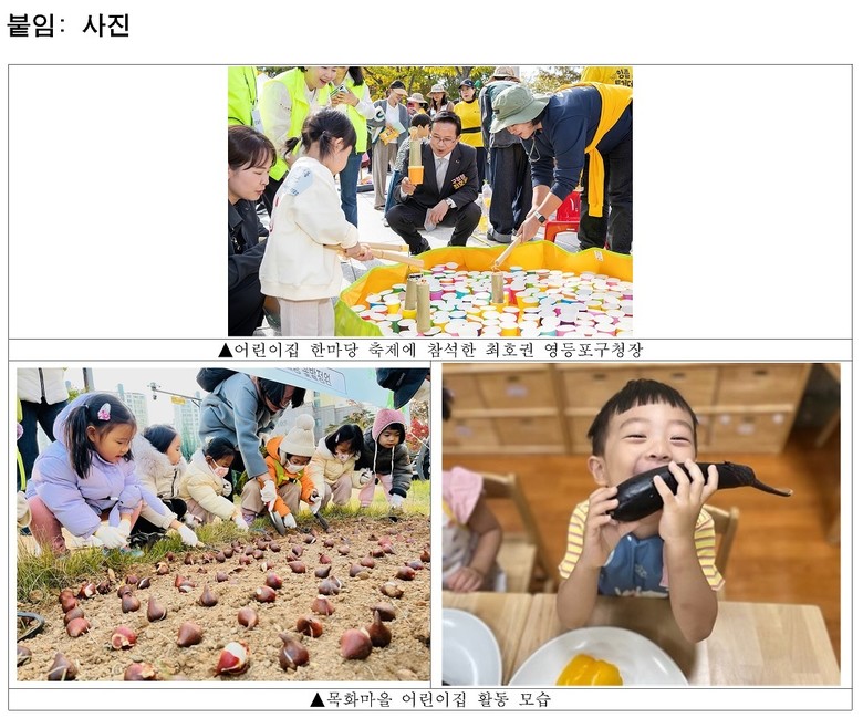 최호권 영등포구청장은 “모아어린이집은 어린이집 사이의 벽을 허물고 아이를 함께 키우는 보육 상생 모델”이라며 “영등포구만의 특색 있는 보육 프로그램이 안정적으로 뿌리내릴 수 있도록 적극 지원해, ‘아이 키우기 좋은 영등포구’를 만드는 데 노력하겠다”라고 전했다.
