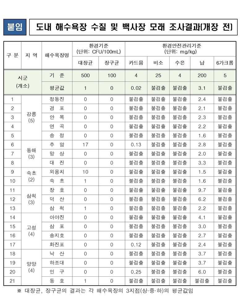 2. 백사장 모래 유해중금속은 환경안전관리기준 이내로 안전 [강원도 세계타임즈=김민석 기자] 강원특별자치도보건환경연구원은 본격적인 여름 휴가철을 맞이하여 도내 해수욕장 21개소를 대상으로 개장 전 해수욕장 수질과 백사장 모래의 안전성 조사를 실시하였다. 조사 결과, 「해수욕장의 이용 및 관리에 관한 법률」의 환경기준에 모두 적합한 것으로 확인되었다.