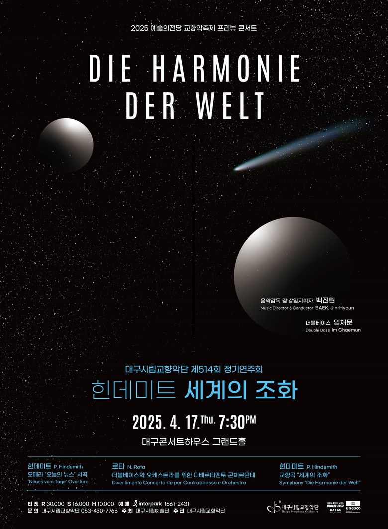 □ 백진현 상임지휘자는 “힌데미트 탄생 130주년인 올해, 그의 두 작품을 대구시향의 연주로 국내 처음 소개하게 되어 기쁘다. 이번 공연은 클래식 레퍼토리의 확장과 다양성을 제공하고, 관객에게 신선함을 선사하는 의미가 크다. 특히 대구시향에게는 ‘도전’과 ‘성장’의 기회였다. 끊임없이 변화하는 악상이 특징인 ‘세계의 조화’ 교향곡은 연주자에게는 까다롭고, 관객에게는 낯설 수 있지만 함께 듣고 배우며 경험하는 시간이 되기를 바란다. 또한 이번 공연이 현대음악에 한 걸음 더 다가서는 기회가 되었으면 한다”고 소감을 전했다.