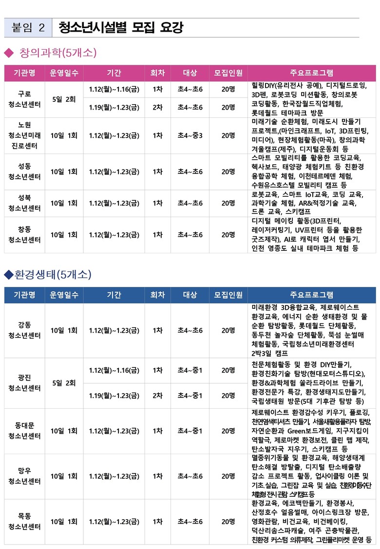 한편, 서울시는 참가 청소년들의 안전을 최우선으로 확보하기 위해 캠프 기간, 타 지역 이동이나 숙박형 프로그램 진행 시 보험 가입 및 수련활동 신고 등 관리 체계를 강화했다.