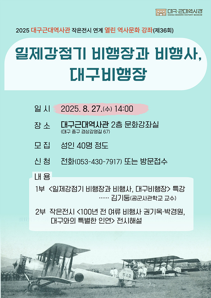 이번 특강은 일제강점기부터 이어지는 대구비행장의 역사를 시민들과 공유하는 자리가 될 것으로 기대된다.