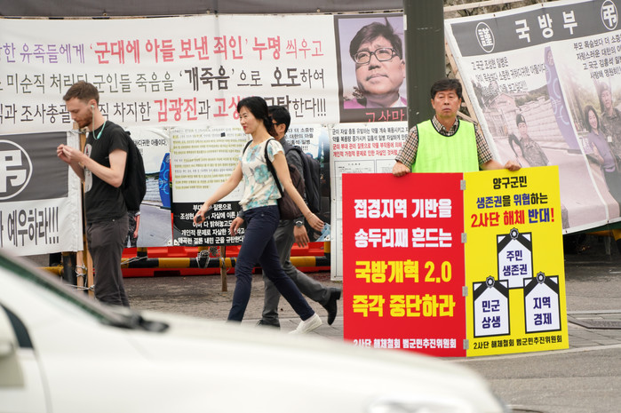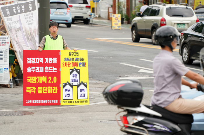 [양구군=세계타임즈 김민석 기자] 이상건 양구군의회의장이 29일 서울 용산 국방부 정문에서 2사단 해체철회 피켓을 들고 1인시위를 하고 있다.