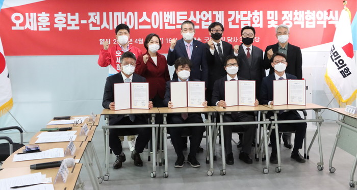 정책협약에는 오세훈 서울시장 후보가 코로나19로 어려움을 겪고 있는 이벤트, 전시, 마이스산업의 회생과 지속 성장을 위해 긴밀히 협력하고 종합적인 지원대책을 마련하겠다는 내용을 담고 있다.