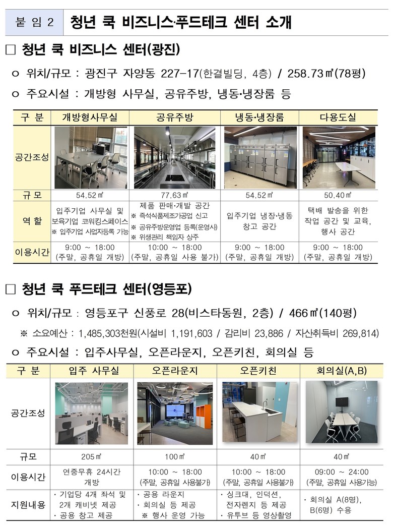 ‘청년 쿡 비즈니스‧푸드테크 센터’는 식품 제조 분야 청년 스타트업의 성장을 지원하는 전문 보육 기관이다. 서울시는 공간은 물론, 사업화 자금, 멘토링, 판로 개척 지원 등을 통해 보육기업이 경쟁력을 갖출 수 있도록 돕고 있다.