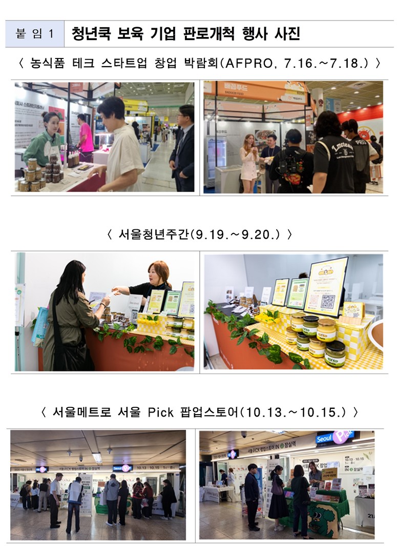 - 푸드위크 등 대형 전시회‧유통 플랫폼 연계해 소비자 접접 확대…민간 입점 제안도 이어져 [서울 세계타임즈=이장성 기자] 서울시 ‘청년 쿡 비즈니스‧푸드테크 센터’ 보육기업이 판로개척 행사를 통해서 ’25년 한 해 동안 총 5,600만 원 규모의 매출 성과를 거뒀다. 서울시가 보육기업 제품의 판로 개척을 적극적으로 지원한 결과다.