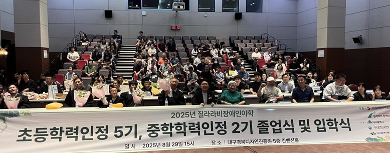 ○ 장 소 : 대구경북디자인진흥원 5층 컨벤션홀 [세계타임즈=대구 한윤석 기자] 질라라비장애인야학이 2025년 학력인정 과정 초등 5기, 중학 2기 졸업식 및 입학식을 개최했다. 이번 졸업식에서는 학력인정 과정을 이수한 졸업생 11명(초등 7명, 중학 4명)이 졸업장을 수여 받았으며, 신입생 12명(초등 3명, 중학 9명)이 입학해 새로운 배움의 출발을 알렸다.