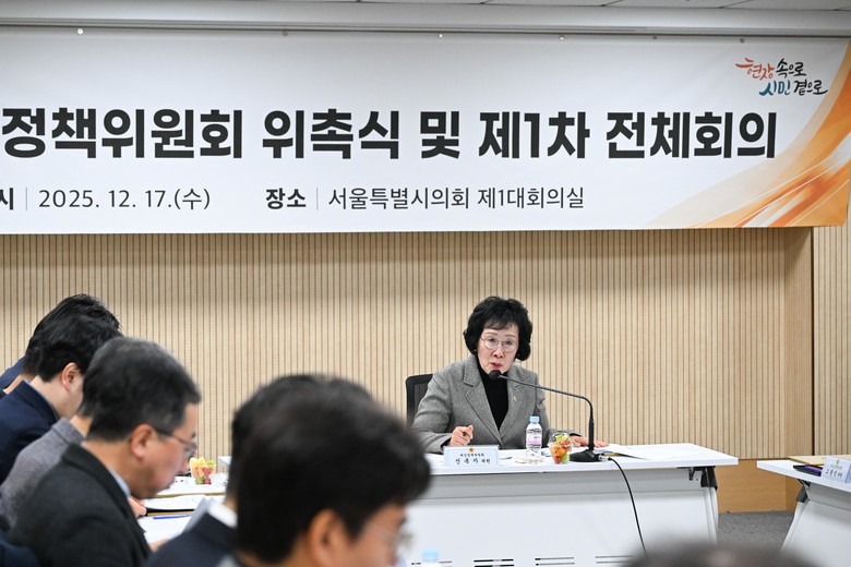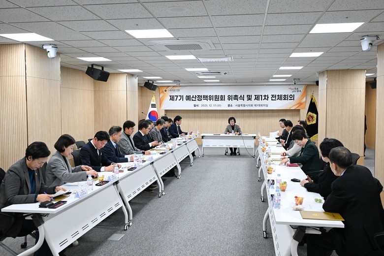 [서울 세계타임즈=이장성 기자] 서울특별시의회는 2025년 12월 17일(수) 제1대회의실에서 위촉식과 제1차 전체회의를 개최하여 시의회의 예산정책기능 강화를 위한「제7기 예산정책위원회」를 출범시켰다. 이날 최호정 의장(서초4, 국민의힘)은 위원들에게 위촉장을 수여하였고, 이후 진행된 제1차 전체회의에서 신복자 의원(동대문4, 국민의힘)이 위원장으로 선출되었다.