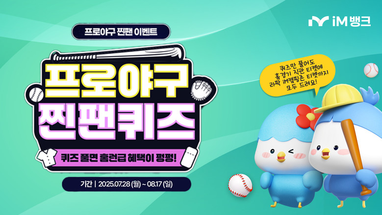 본 이벤트는 7월 28일(월)부터 8월 17일(일)까지 참여 가능하며, 신규·기존 고객 구별없이 iM뱅크(아이엠뱅크) 앱에 접속해 이벤트 페이지에서 야구 퀴즈를 맞추면 자동 응모된다.