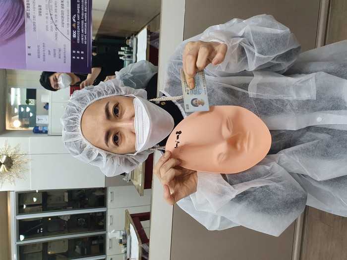 (사진=지난 20일 열린 '제1회 ISO17024 국제미용평가경연대회'의 한 참가자가 본선에 앞서 자신의 신분을 확인하기 위해 신분증과 마스크를 들어 보이고 있다. 서울=전국기자협회)
