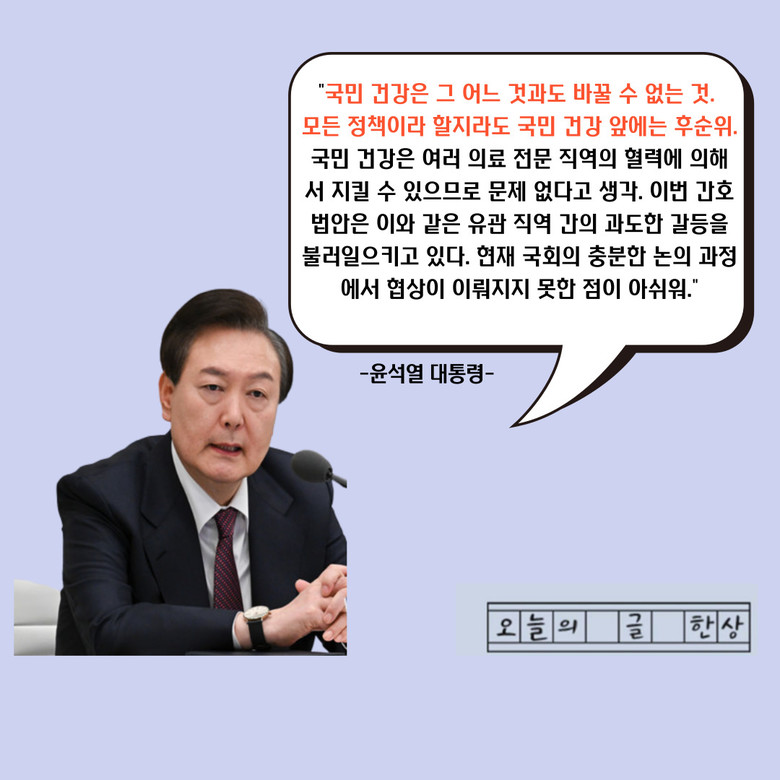 2호 법률안 거부권' 행사한 윤 대통령은 “국민 건강은 그 어느 것과도 바꿀 수 없는 것. 모든 정책이라 할지라도 국민 건강 앞에는 후순위.”라고 말하며 입장을 확고히 다졌다.