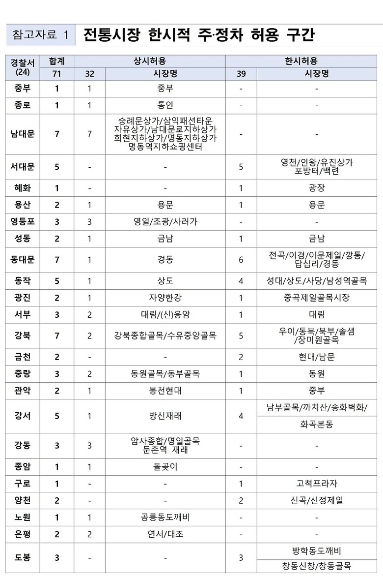 또한 교통편의 극대화를 위해 전통시장 주·정차를 허용하고 ‘보행 중심’ 교통관리를 시행한다. 전통시장 이용객을 위해 주변 도로 주·정차를 한시적으로 허용하여 교통 불편을 해소하고 ‘서울 교통·기본질서 Re-디자인’ 사업을 연계해 보행자 안전을 최우선으로 하는 교통관리로 안전한 시장 환경을 조성한다.