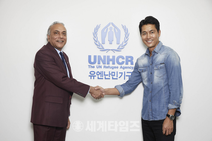 유엔난민기구 친선대사 배우 정우성(오른쪽)이 24일 서울 중구 유엔난민기구(UNHCR) 한국대표부 사무실에서 인터뷰에 앞서 나비드 사이드 후세인 유엔난민기구 대표와 인사를 나누고 있다. 정우성은 인터뷰를 통해 "한국사회가 난민 문제에 대해 더 깊은 관심을 가질 것"을 촉구했다. 2017.06.24. (사진 = 유엔난민기구 제공)