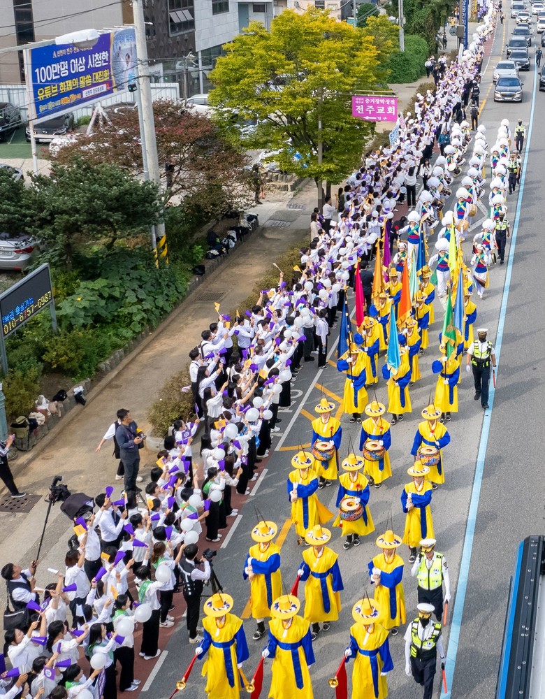 | ▲13일 ‘신천지 전주 전도 대성회’가 신천지 전주교회에서 열린 가운데 참석자들을 환영하는 퍼레이드가 열리고 있다 [사진 제공 = 신천지 도마지파] |