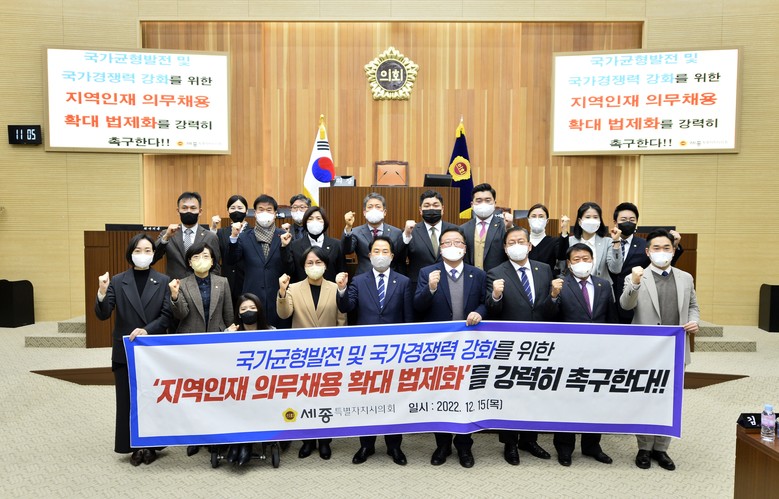 이날 본회의에서는 박란희‧김현옥‧김재형‧김효숙‧김광운 의원이 5분 자유발언을 통해 시정 발전에 필요한 정책 대안을 제시한 데 이어, 세종시의회 의원 전원이 공동 발의한 ‘지역인재 의무 채용 확대 법제화 촉구 결의안’을 채택했다.