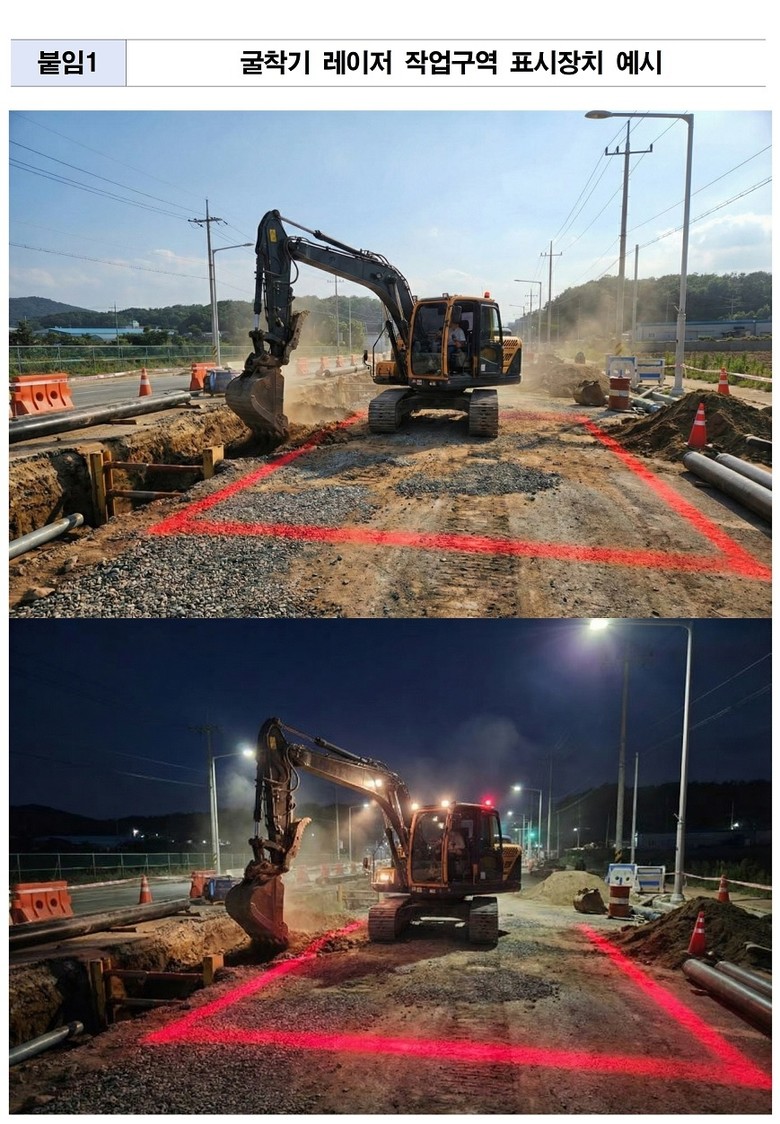 아울러 누수 복구 및 급수 공사 등 굴착이 수반되는 상수도 공사장에서 중장비 접촉·접근 사고를 예방하기 위해 ‘레이저 작업구역 표시장치’를 도입한다. 굴착기 작업 바닥에 시인성 높은 레이저 빔으로 작업 반경을 표시해 작업 구역 인지도를 높이고, 작업자와 시민의 안전을 강화할 계획이다.