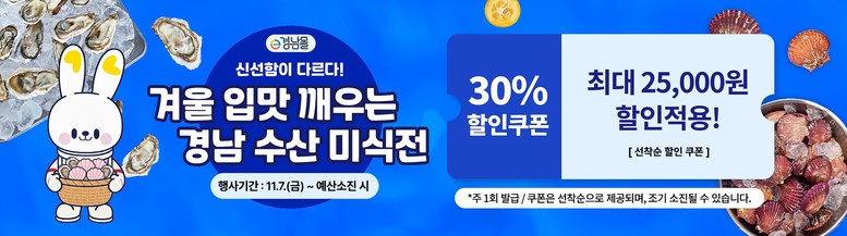 먼저, 오는 7일 입동(立冬)을 맞이해 온라인 ‘e경남몰’에서 ‘겨울 제철 수산물 특별 할인 기획전’을 진행한다. 도내 수협과 수산물 가공업체 70여 곳이 참여해 굴, 가리비 등 제철 수산물과 가공품 400여 개 품목을 최대 30% 할인된 가격으로 판매한다. 소비자는 주 1회 발행되는 할인쿠폰을 통해 최대 25,000원의 혜택을 받을 수 있어, 신선한 수산물을 합리적인 가격에 만나볼 수 있다,
