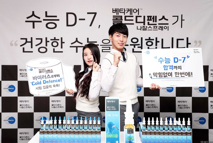 한국먼디파마(유)(대표이사 이명세)는 대학수학능력시험(수능) D-7을 맞아 9일에 수험생 응원 이벤트를 남대문로 서울스퀘어빌딩 본사에서 진행하고 수능 당일인 오는 16일에 각 학교에서 호흡기 감염 대응법을 알리고 베타케어™ 콜드디펜스 나잘스프레이를 증정할 예정이라고 밝혔다.