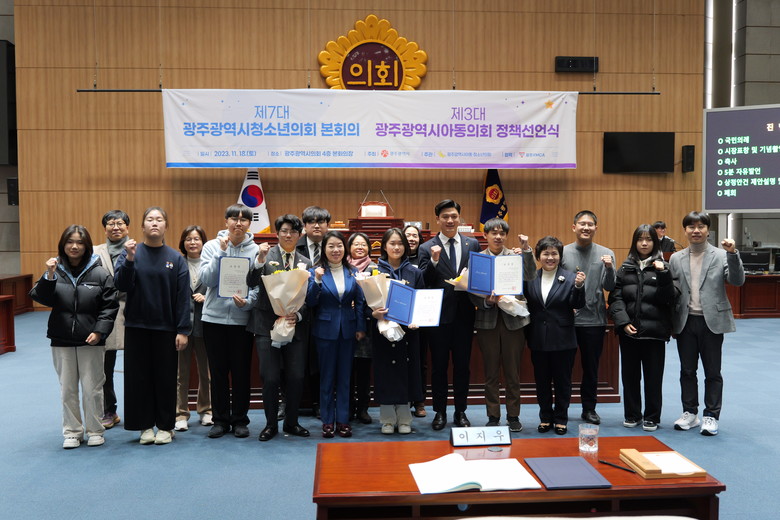 - 청소년증 인식 개선 등 정책 제안…표창장 수여도 [광주 세계타임즈=손권일 기자] 광주광역시(시장 강기정)는 지난 18일 광주시의회 본회의장에서 제7대 청소년의회 본회의와 제3대 아동의회 정책선언식을 개최했다.