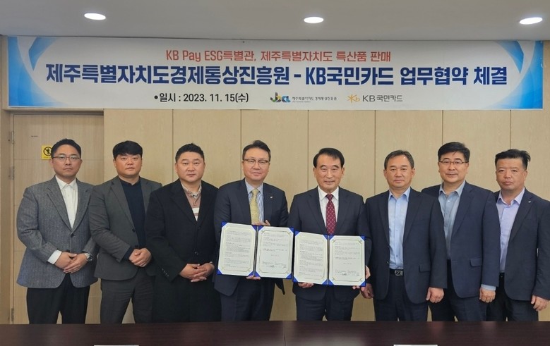 15일 제주특별자치도 경제통상진흥원(이하 진흥원)에서 KB국민카드 이호준 상무와 제주 경제통상진흥원 오재윤 원장이 참석한 가운데 KB Pay 쇼핑을 통한 제주도 특산품 판매를 지원하는 업무협약을 체결했다.