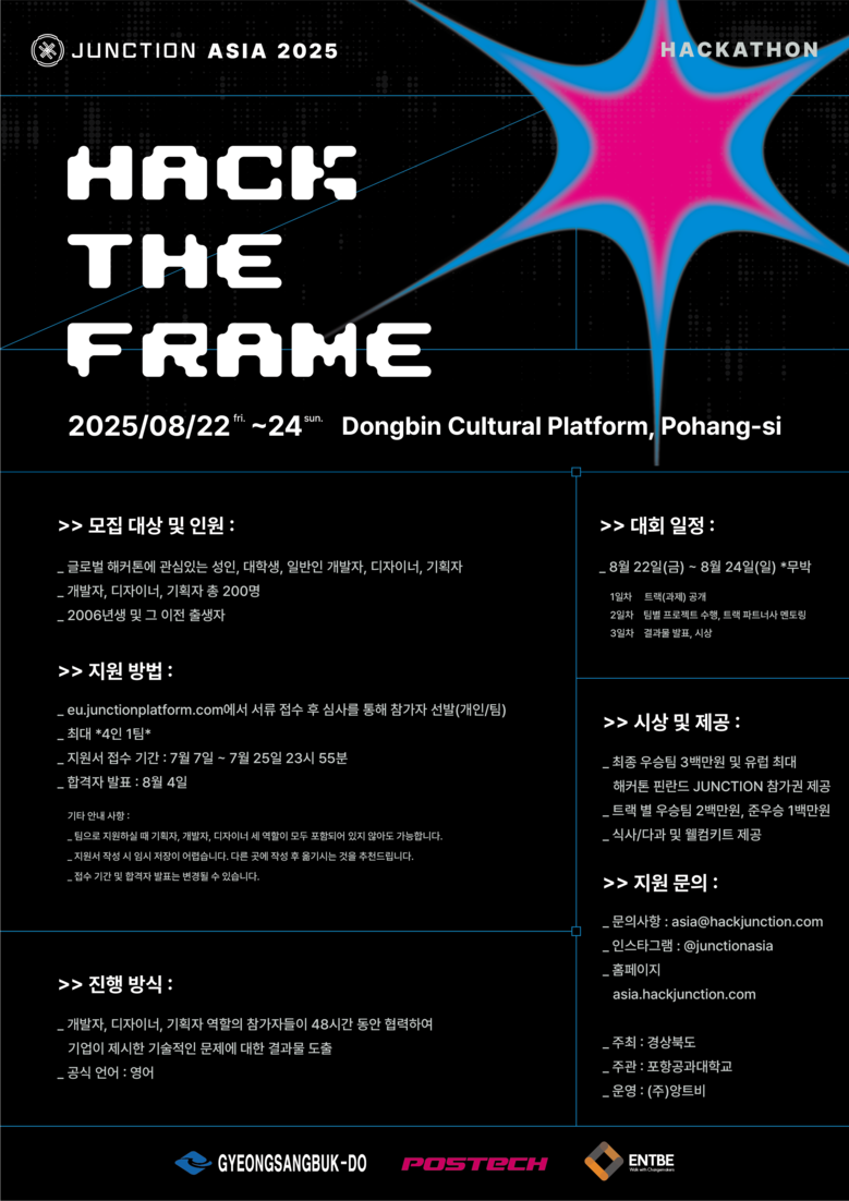 ‘정션 아시아(JUNCTION ASIA)’는 유럽 최대 기술 해커톤 ‘정션(JUNCTION)의 아시아 버전으로, 기술과 창의성, 도전 정신을 갖춘 글로벌 혁신 플랫폼으로 자리매김 하고 있으며, 경상북도는 2024년에 경주 하이코에서 개최, 올해 2회째 해커톤 대회를 통해 지역청년들의 도전정신과 새로운 가능성을 실험하는 기회를 선사할 예정이다.