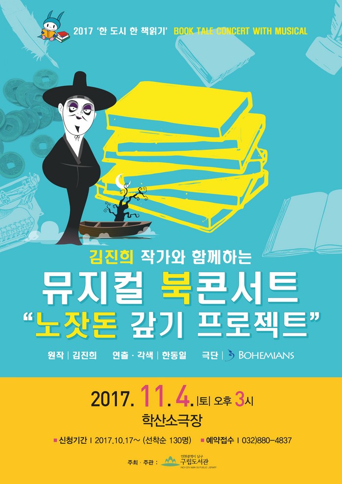 북콘서트에서는 한 도시 한 책읽기 선정도서인 ‘노잣돈 갚기 프로젝트’를 뮤지컬로 각색한 공연이 선보일 예정이다.