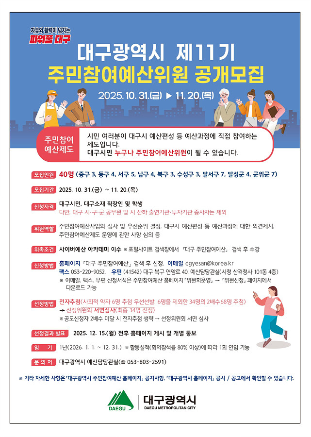공모 기간은 10월 31일부터 11월 20일 오후 6시까지이며, 대구시 주민참여예산 홈페이지(jumin.daegu.go.kr) 또는 이메일(dgyesan@korea.kr), 팩스, 우편을 통해 응모할 수 있다.
