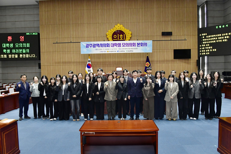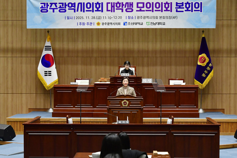 [광주 세계타임즈=손권일 기자] 광주광역시의회(의장 신수정)는 11월 28일(금), 시의회 본회의장에서 조선대학교·전남대학교와 함께 ‘대학생 모의의회 본회의’를 개최했다.
