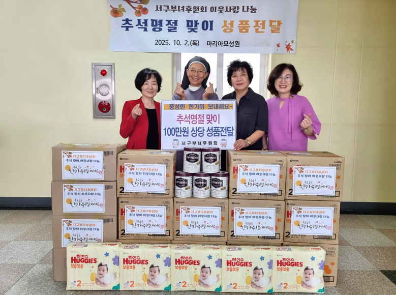 [서구 세계타임즈=이용우 기자] 부산 서구부녀후원회(회장 이재선)는 지난 10월 2일 추석 명절을 맞아 암남동에 위치한 한부모가족복지시설 마리아모성원을 방문해 영유아용품(분유, 기저귀 등 100만 원 상당)을 전달하며 이웃사랑을 실천했다.