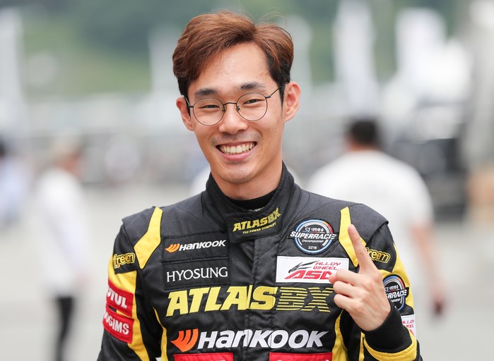[사진설명]아트라스BX 모터스포츠의 김종겸이 25일 에버랜드 스피드웨이에서 열린 2019 CJ대한통운 슈퍼레이스 챔피언십 2라운드 ASA 6000 클래스 예선에서 1위를 차지한 뒤 밝게 웃고 있다.