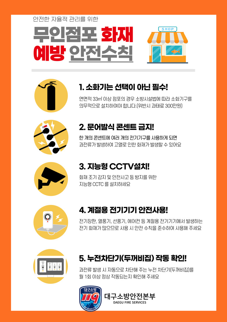 이에 대구소방안전본부는 관내 무인점포에 대해 맞춤형 화재예방대책을 추진할 예정이다.