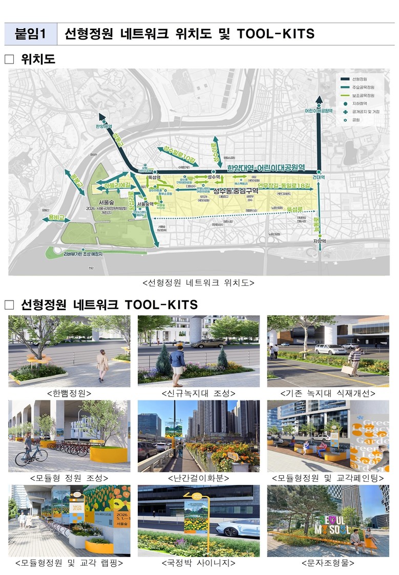 선형정원 네크워크는 주요 간선도로인 왕십리로, 아차산로, 능동로 등 주요노선 6.5km 구간과 ‘감성과 트렌드’가 공존하는 성수동 연무장길 등 주요 골목길 3.5km 구간을 포함해 주요 간선도로와 골목길을 접한 성수동과 자양동 일대 공원 및 광장, 자투리 공간 등 3만㎡이다.