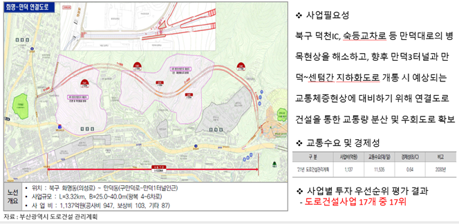 ◇ 만덕3터널과 만덕~센텀간 지하화도로 개통 대비‘화명~만덕 연결도로’적기 추진