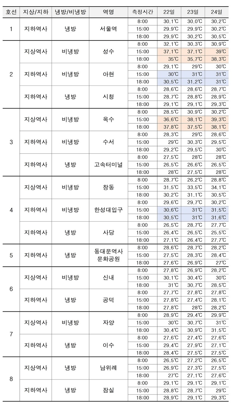 조사 기간 서울의 외부 최고 기온은 22일 32.2℃, 23일 33.3℃, 24일 34.1℃였으나, 지하철 역사 내부 온도는 외부보다 훨씬 높거나 비슷한 수준을 보였다.