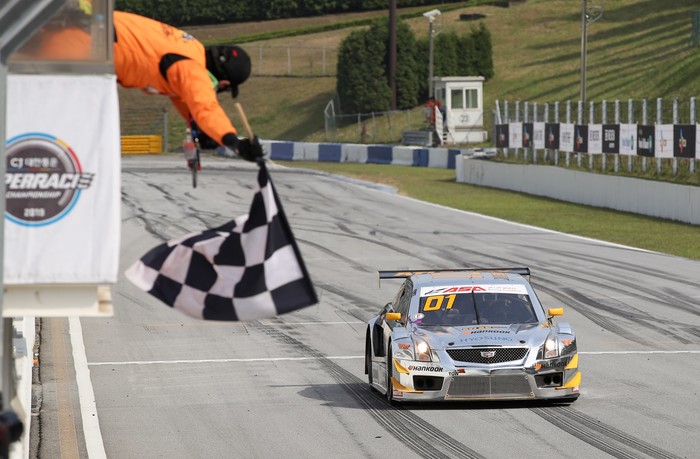 [사진설명]김종겸이 26일 에버랜드 스피드웨이에서 열린 2019 CJ대한통운 슈퍼레이스 챔피언십 2라운드 ASA 6000 클래스 결승전에서 가장 먼저 체커기를 받고 있다.