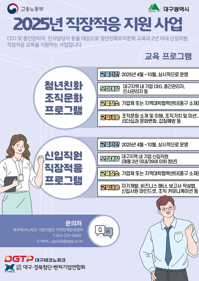 ▸ 올해 7억 원 사업비 확보해 직장문화 개선과 직장적응 지원 교육 추진 [세계타임즈=대구 한윤석 기자] 대구광역시는 청년 근로자들이 직장 환경에 원활하게 적응할 수 있도록 기업의 관리자와 청년을 대상으로 청년친화 조직문화 교육과 신입 직원 직장적응 지원 교육을 확대 추진한다.