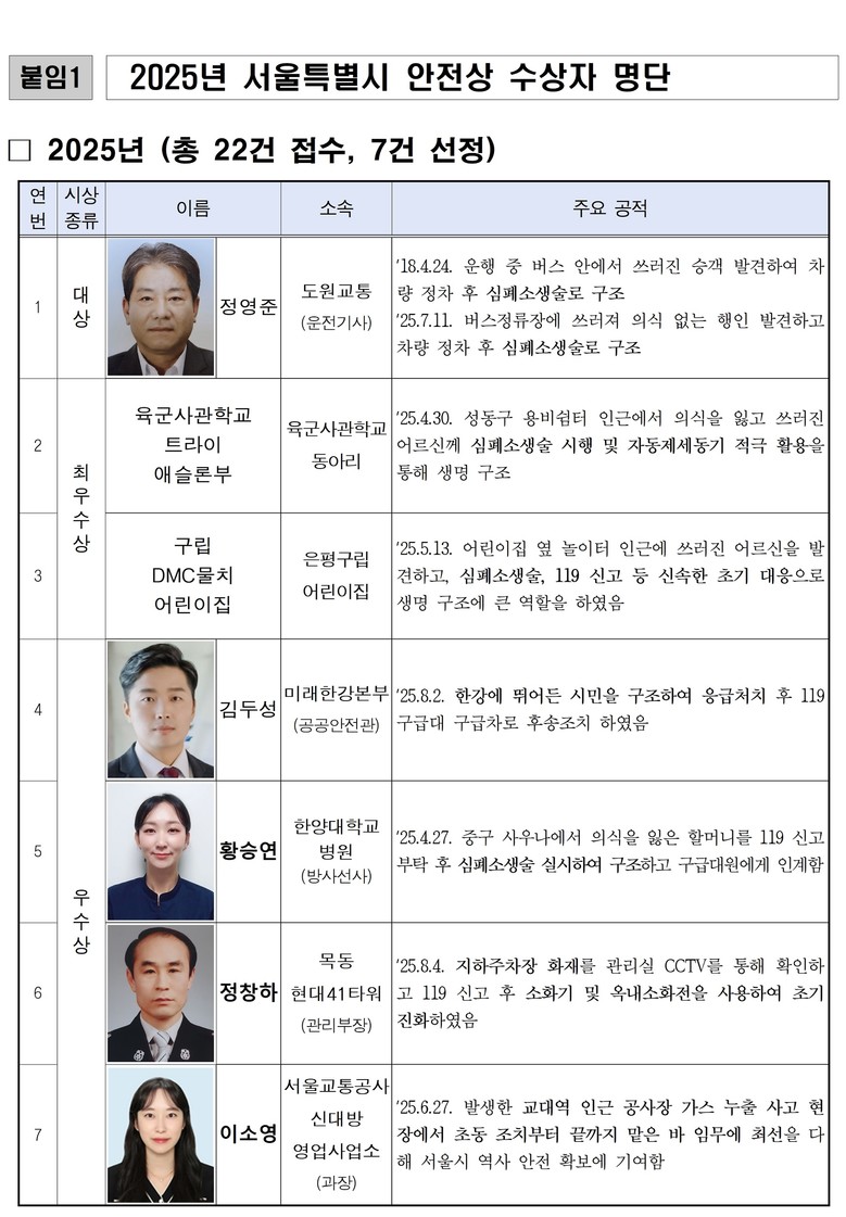 서울시는 정영준 님을 포함해 7명(단체 포함)을 ‘서울특별시 안전상’ 수상자로 선정하고 7일(금) 시상식을 개최한다고 밝혔다.