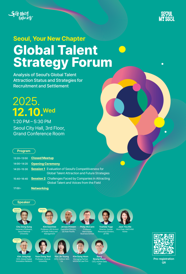 서울시는 10일(수) 14시 서울시청 대회의실(3층)에서 「글로벌 인재 전략 포럼 Seoul, Your New Chapter」을 개최하여 서울의 글로벌 인재 유치 현황을 점검하고 향후 발전 방향을 모색했다. 현장에서는 인재 유치와 정착 전략을 중심으로 도시와 기업 경쟁력 강화를 위한 심도 있는 토론이 이루어졌다.