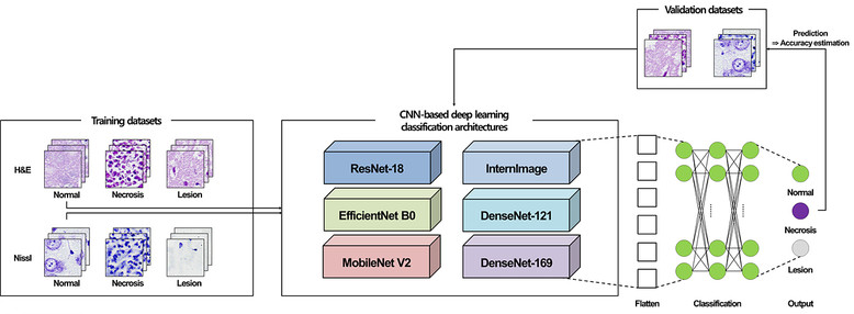 연구진은 뇌졸중을 유발한 전임상 동물모델의 뇌 조직 병리염색 영상에서 뇌졸중 병변과 괴사성 세포가 존재하는 영역을 탐지·분류를 위한 알고리즘에 가장 최적화된 딥러닝 영상 분류 모델들을 적용, 성능을 비교 분석했다.