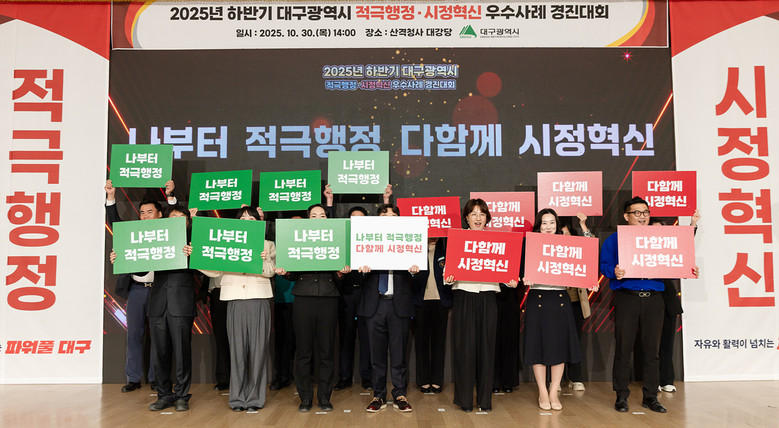 ▸ 적극행정 분야 ‘전국 최초 교동 음식물 수거 실명제’, 시정혁신 분야 ‘대구·경북 통합 환승체계 구축’ 최우수 사례 선정 [세계타임즈=대구 한윤석 기자] 대구광역시는 10월 30일(목) 산격청사 대강당에서 ‘2025년 하반기 적극행정·시정혁신 우수사례 경진대회’를 개최하고, 총 14건의 우수사례(최우수 2, 우수 4, 장려 8)를 선정해 시상했다.
