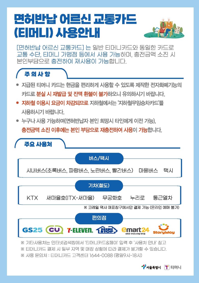 ‘서울특별시 고령운전자 교통사고 예방을 위한 지원 조례’ 시행일인 ’19.3.28. 이후 서울에 주민등록된 상태에서 운전면허 자진반납했지만 교통카드를 수령하지 못하고 운전면허만 실효된 경우는 가까운 경찰서에서 발행한 ‘운전면허취소결정통지서’와 신분증으로 교통카드를 신청하면 된다.