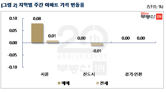 부동산114(www.r114.com)에 따르면 금주 서울 아파트가격 변동률은 0.08%를 기록했다. 재건축 아파트(0.10%)와 일반 아파트(0.08%)가 전주 대비 상승폭이 각각 0.01%p씩 낮아졌다. 신도시와 경기ㆍ인천은 지난 주와 마찬가지로 보합(0.00%)을 기록했다.