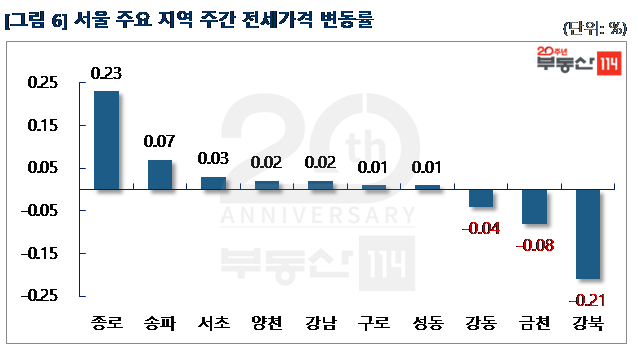 서울 전세가격은 △종로(0.23%) △송파(0.07%) △서초(0.03%) △양천(0.02%) △강남(0.02%) 순으로 올랐다. 종로는 홍파동 경희궁자이2단지가 1,500만원 올랐다. 송파는 가락동 가락금호, 쌍용2차, 가락스타클래스가 1,000만원-5,000만원 오름세를 나타냈다. 서초는 반포주공1단지 이주수요로 인해 인근 지역 전셋값이 강세를 보이면서 잠원동 래미안신반포팰리스, 신반포2차가 2,000만원-5,000만원 올랐다 강남은 역삼동 역삼e편한세상과 개나리푸르지오가 1,000만원씩 올랐다. 양천은 여름방학 학군수요가 움직이면서 목동 일대 전세값이 올랐다. 목동신시가지 1·6단지, 목동파크자이가 500만원-1,500만원 상향 조정됐다. 반면 ▼강북(-0.21%) ▼금천(-0.08%) ▼강동(-0.04%)은 하락했다.