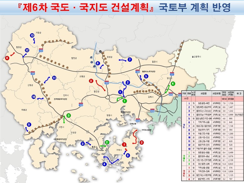 경남도는 도내 주요 간선 도로망 21개 사업(141.4km, 3조 7,556억 원)이 지난달 23일 기획재정부 일괄 예비타당성 조사 대상으로 선정됨에 따라, 이를 제6차 국도·국지도 건설계획에 최대한 반영되도록 행정력을 집중한다.