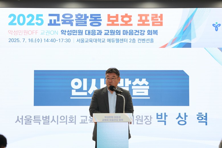 [서울 세계타임즈=이장성 기자] 서울특별시의회 교육위원회 박상혁 위원장(국민의힘, 서초구 제1선거구)은 지난 16일 서울교육대학교에서 개최된 '2025 교육활동 보호 포럼' 에 참석하여 학교 현장의 교육활동 보호에 대한 깊이 있는 통찰과 함께 의회 차원의 강력한 지원 의지를 담은 축사를 전했다.
